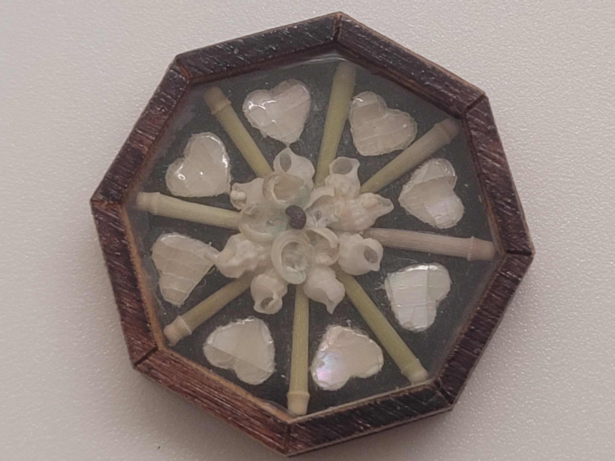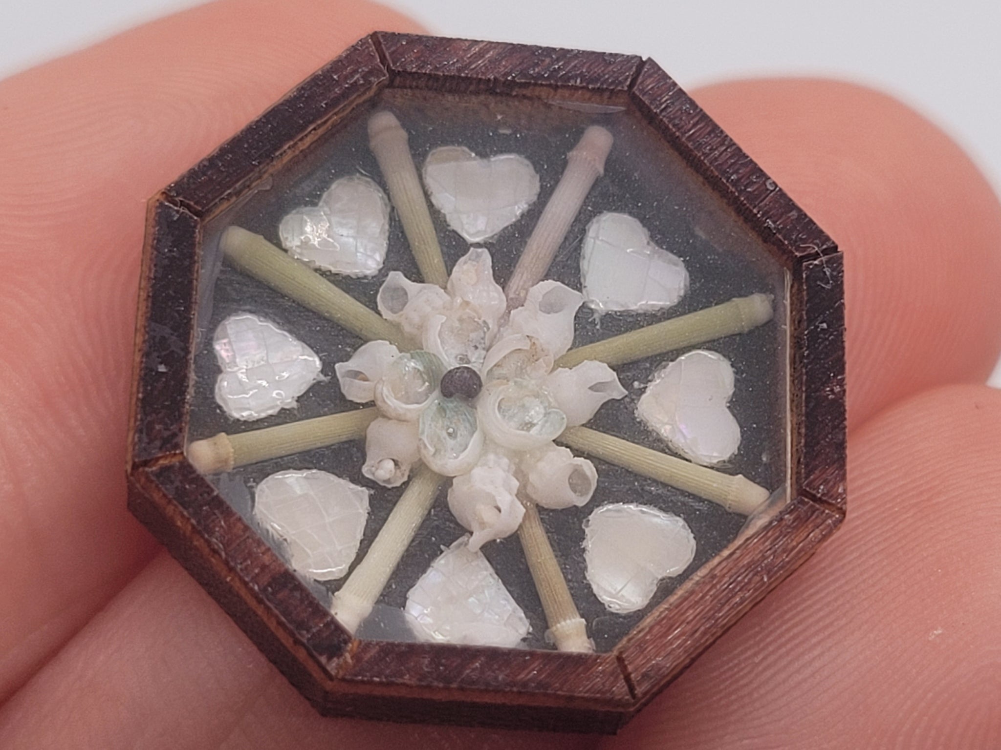 Handmade Miniature by Pam Friend – ¾" Sailor's Valentine with Hearts separated by Green sticks, all surrounding a beautiful Conch design in the center.