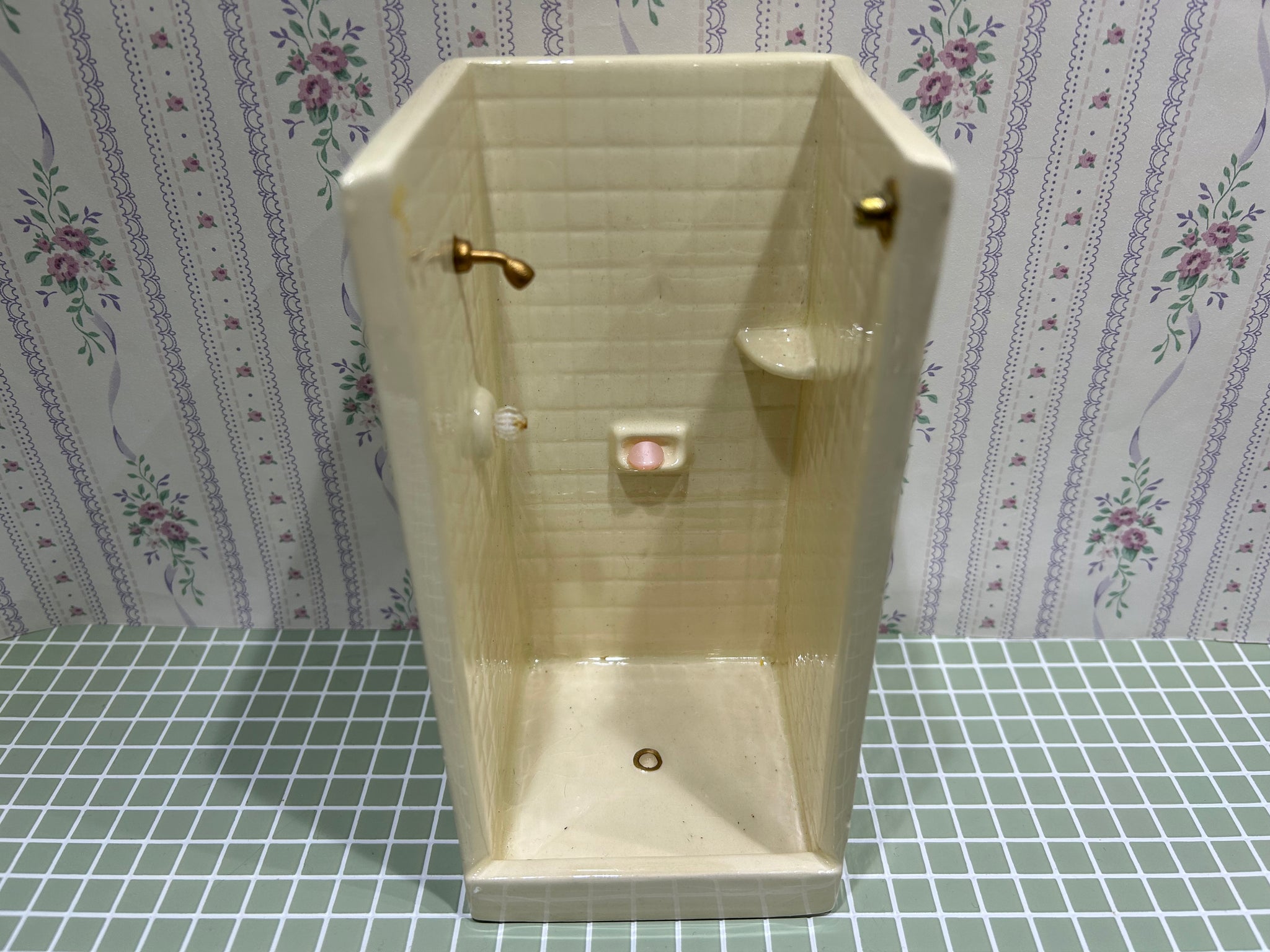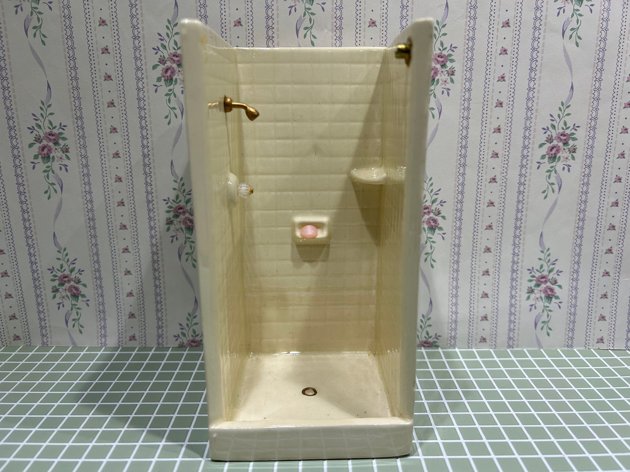 This is a vintage porcelain or ceramic shower. There is no shower curtain, but you can add one. They do not make this any longer. 1/12 scale.