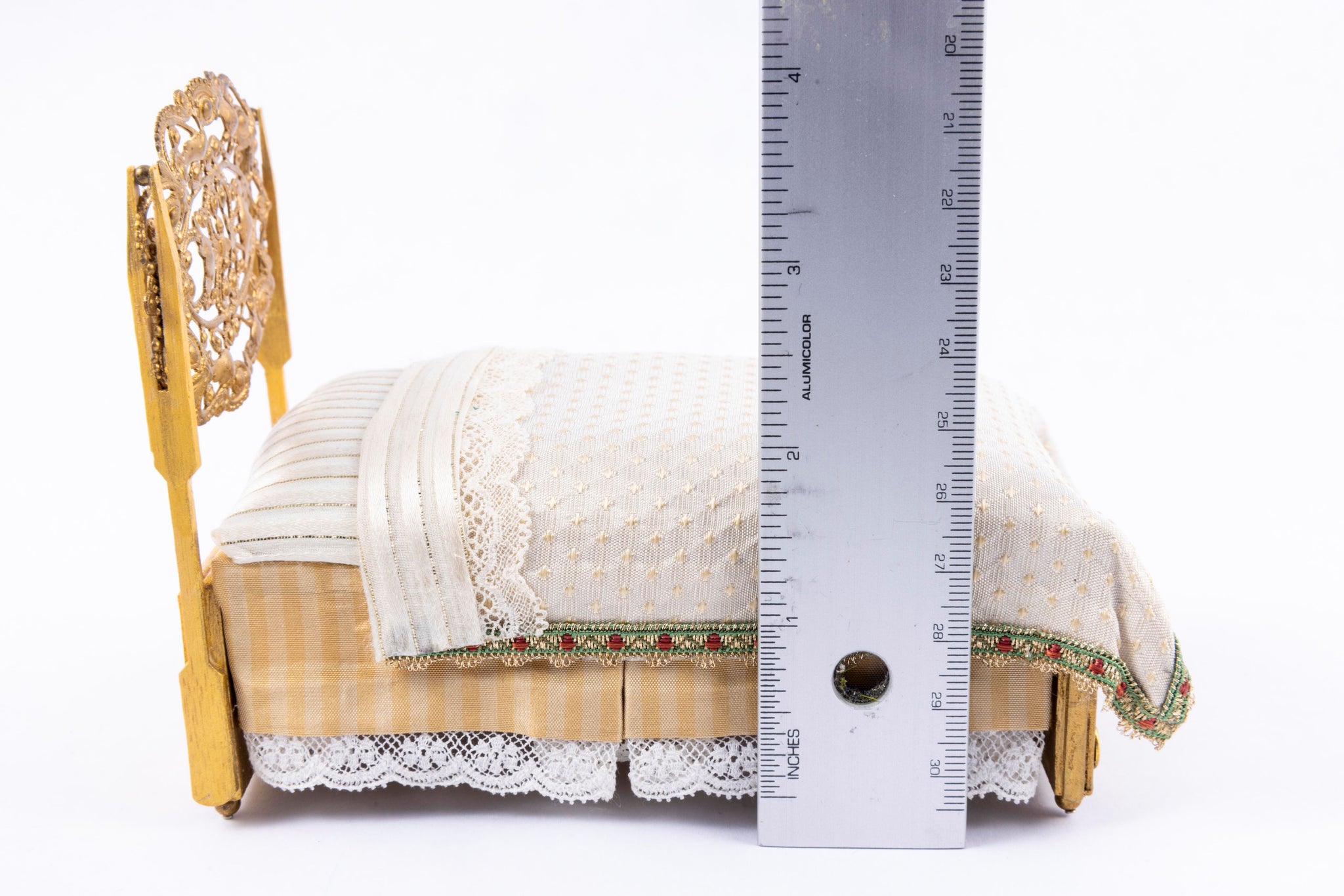 Small twin bed with a gold painted frame. Runs on the smaller end of the 1:12 scale spectrum.