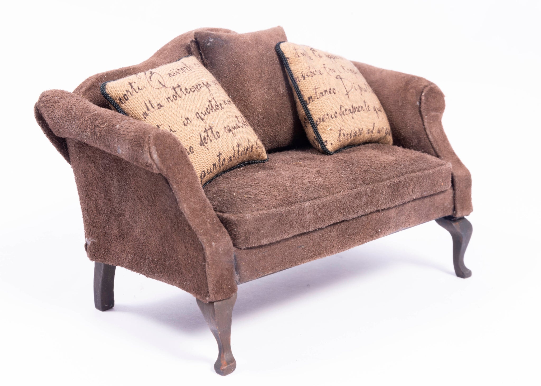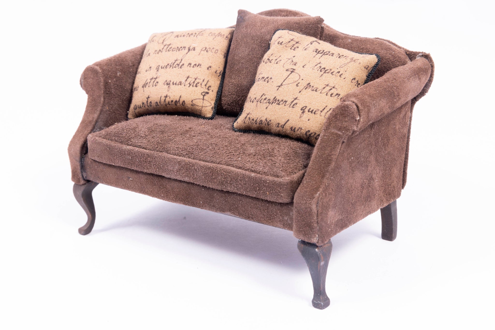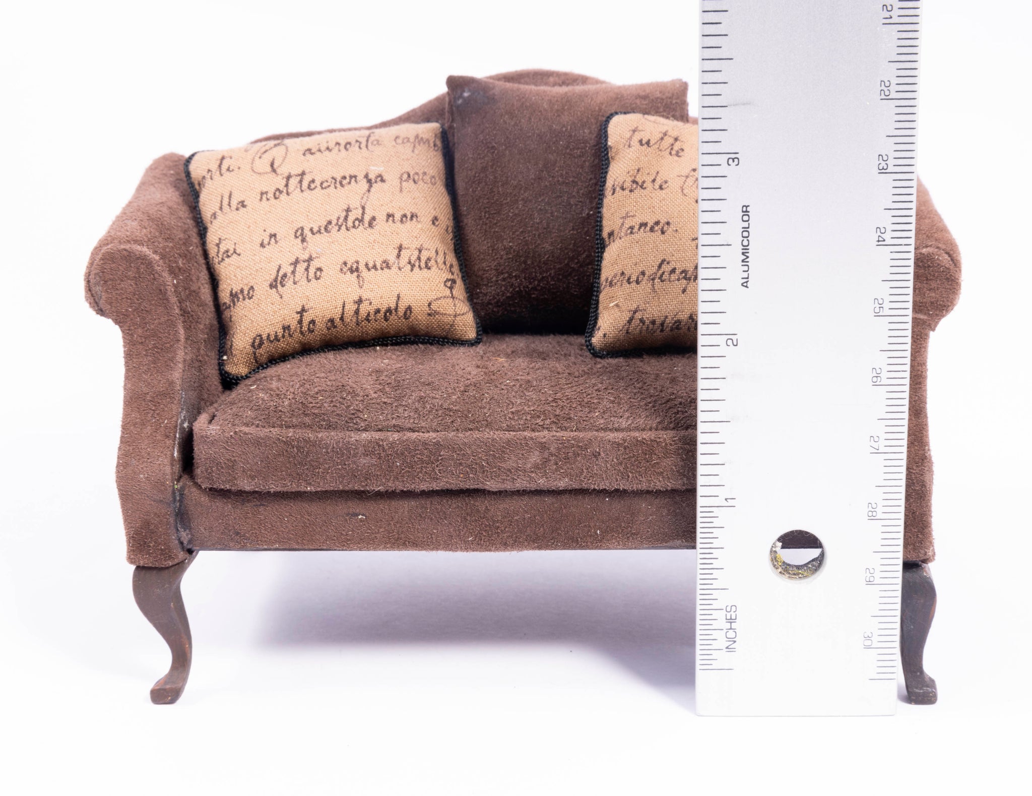 Soft brown fabric sofa with 3 pillows. The pillows are not attached. Pre-owned.