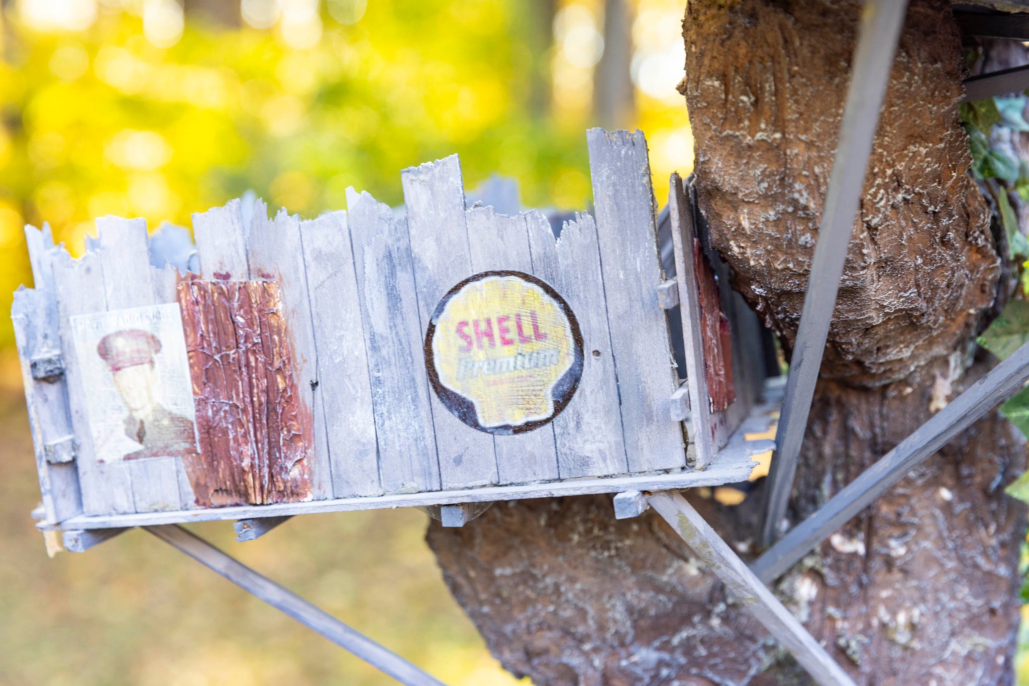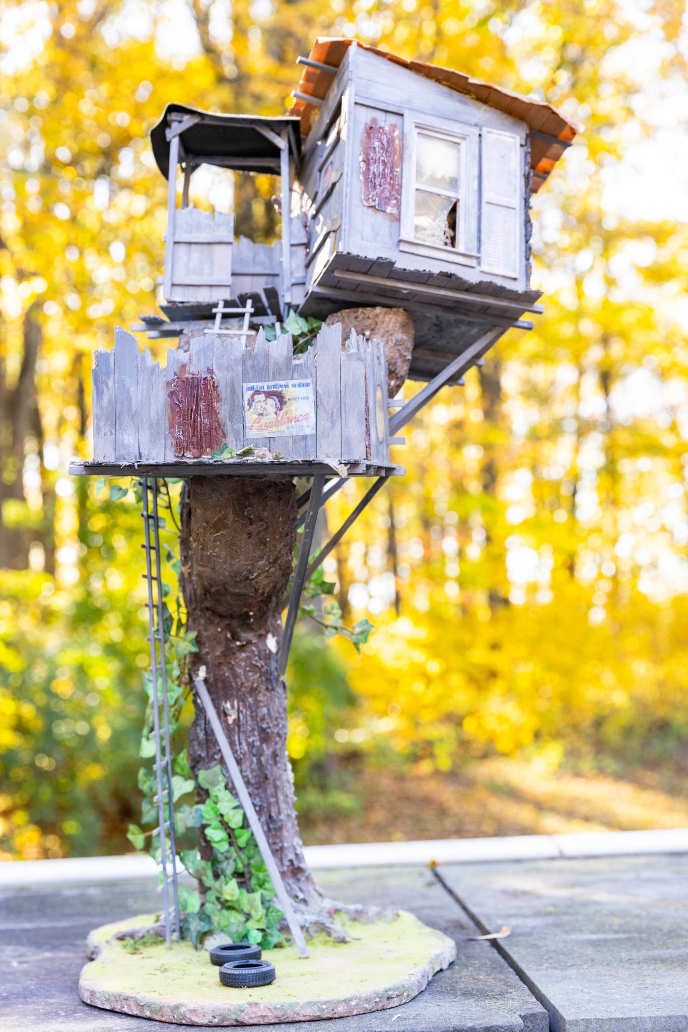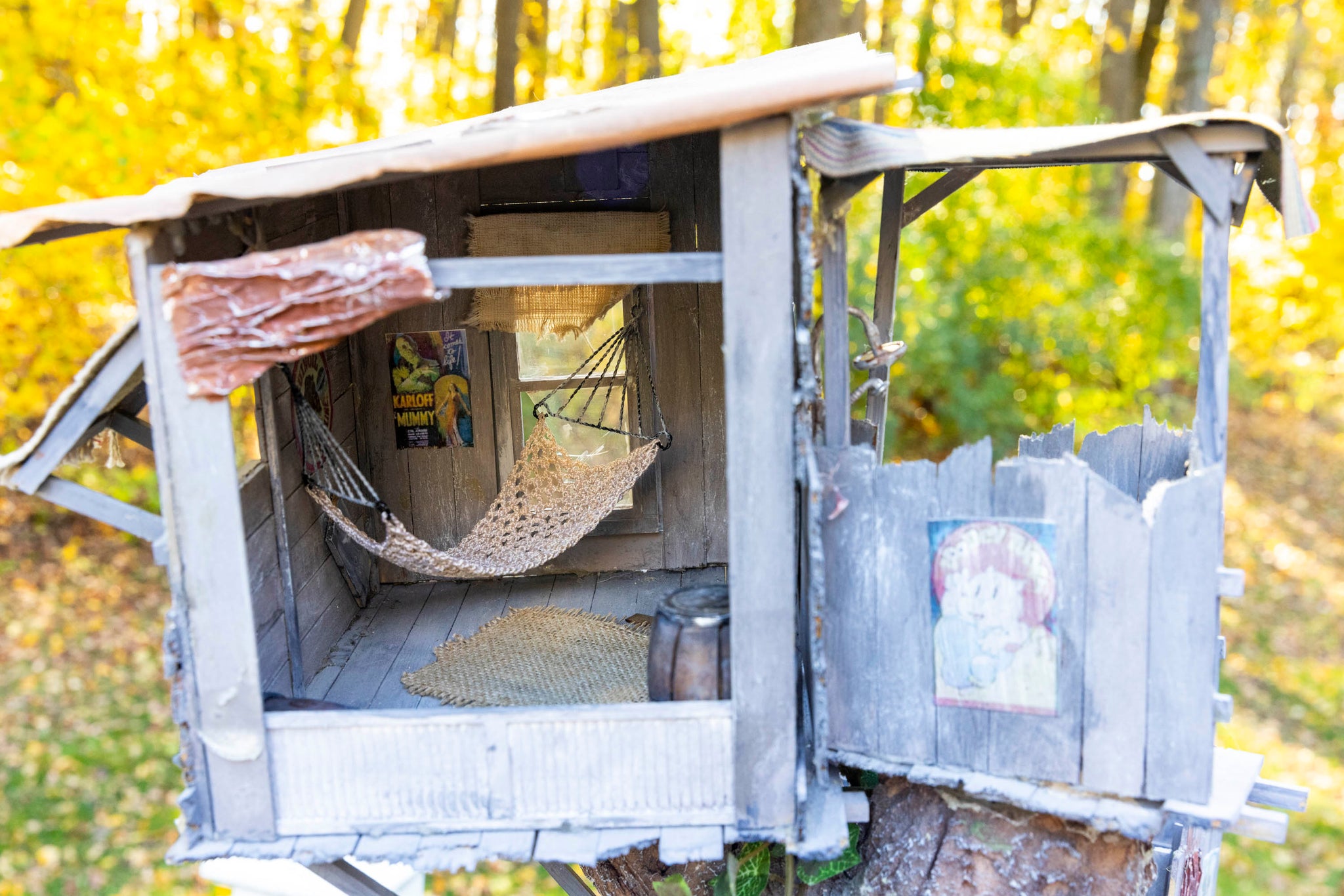 This is a fun tree house with a tire swing, and of course the secret club access. There's a hammock and even a shower! Handmade and great fun!
