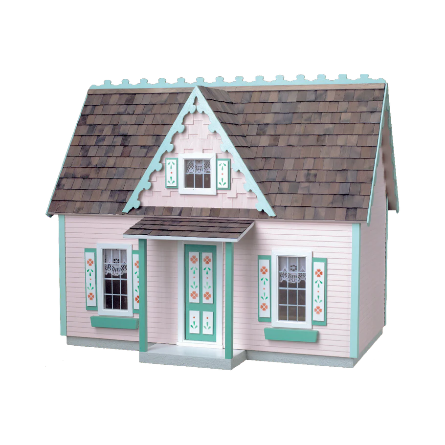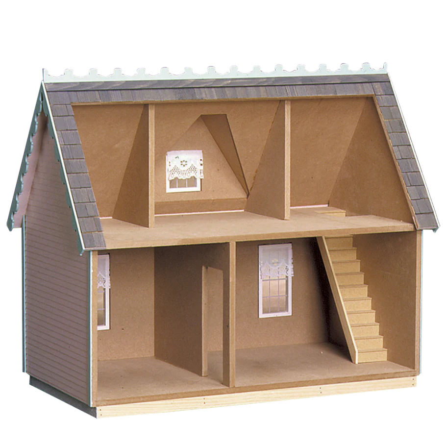 Victorian Cottage Jr. Dollhouse Kit (Real Good Toys) has 5 rooms and measures approximately 24"W x 17 1/2"D x 20"H.