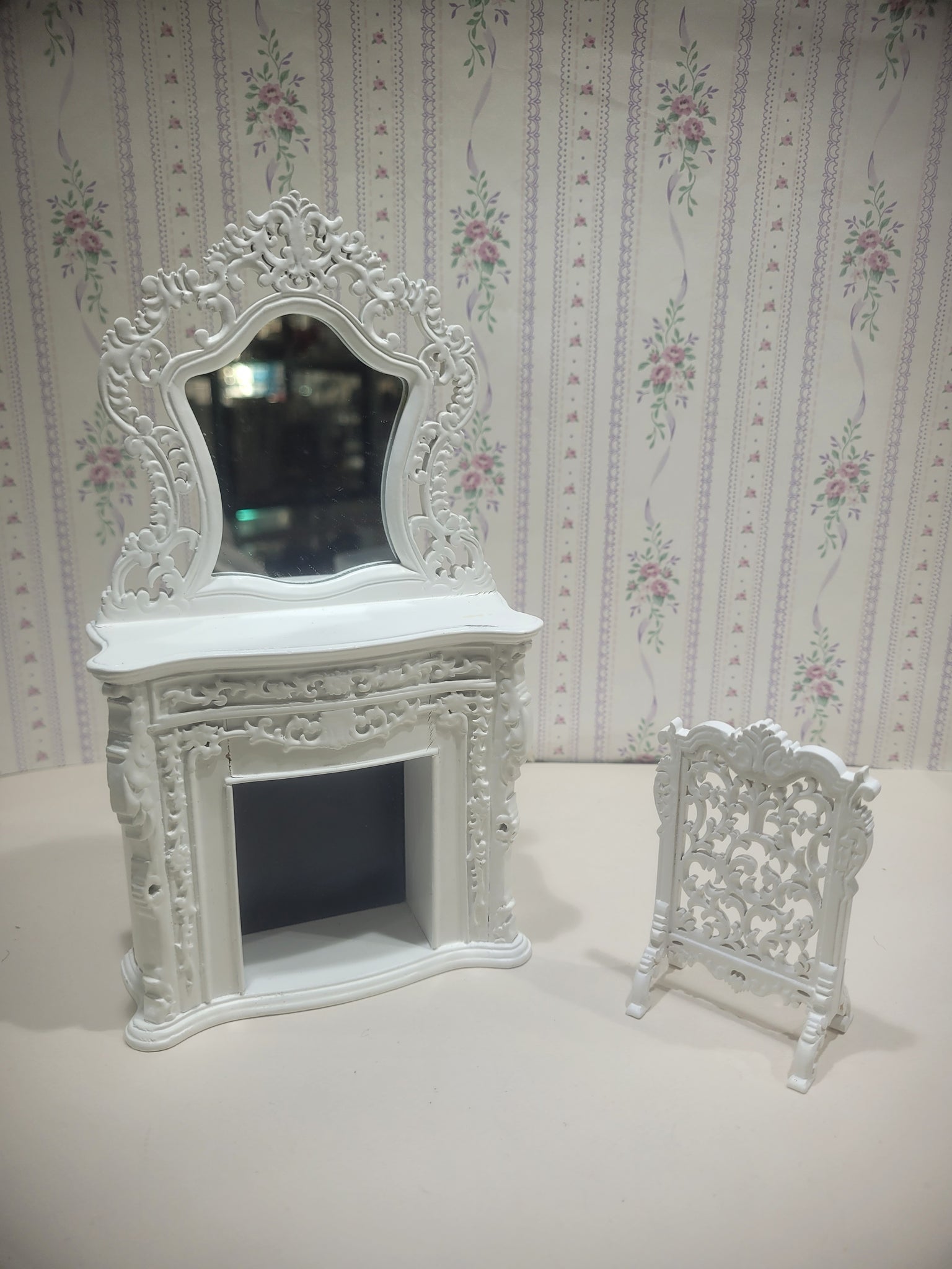 White Ornate Wooden Fireplace with Matching Fireplace Screen