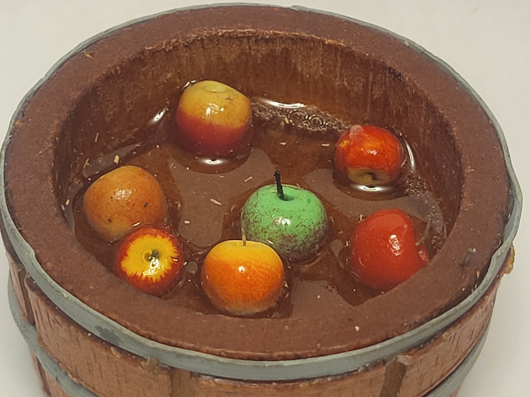 Handmade Miniature Wooden Bucket with Water filled with mixed Variety of Apples for Bobbing.